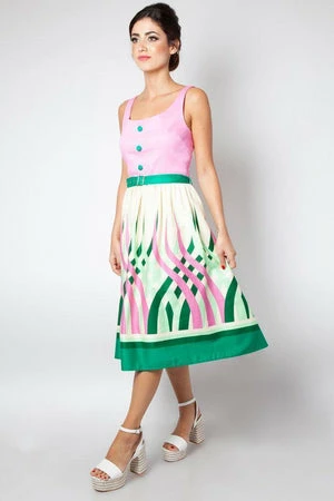 This midi dress has an abstract print, a scoop neckline, contrast fabric coated buttons, belted waist and it fastens at the back with a hidden zipper.