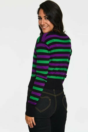 The knitted cardigan has green and purple stripes print, a V-neckline, full length sleeves, rib hem and cuffs and it fastens at the front with glossy buttons.