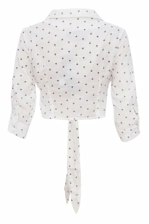 The cropped top has all over anchor print, a crew neckline, ribbon tie detailing, three quarter length sleeve and a flattering fit.